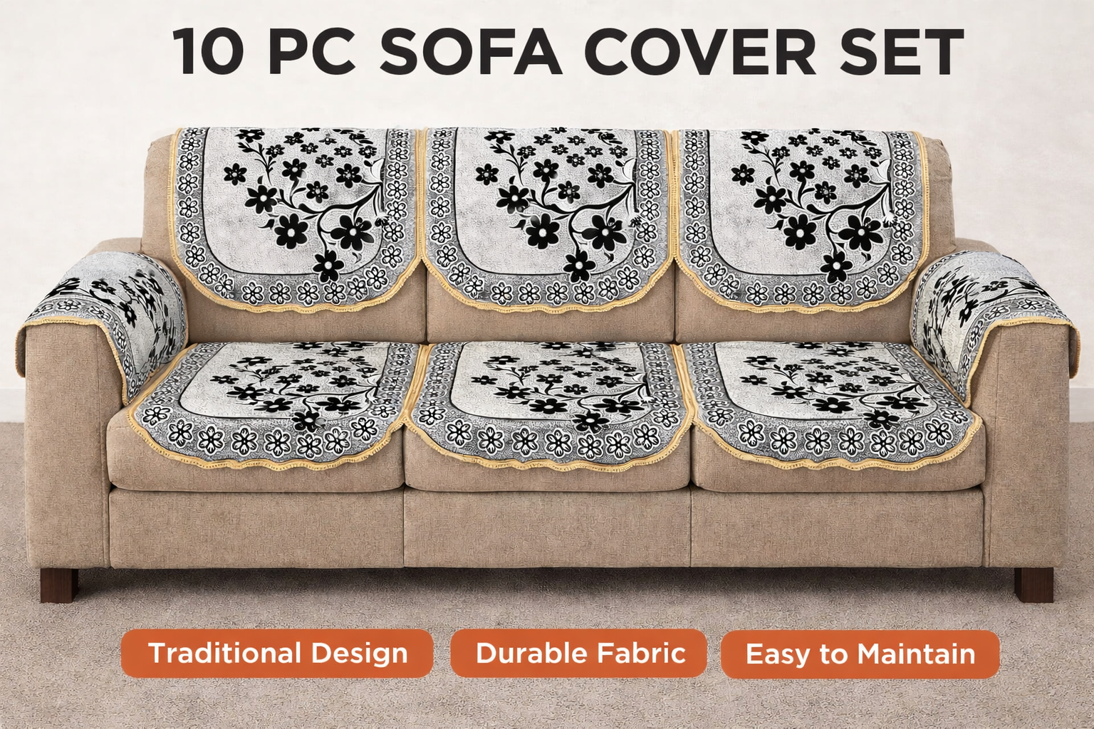 Upgrade your living room instantly with this Premium Comfort 10-Piece Sofa Cover Set featuring an elegant black floral running design. Crafted to protect and beautify your sofa, this set enhances your home décor while keeping furniture safe from dust, stains, and daily wear.