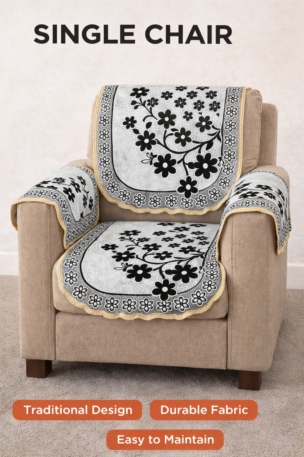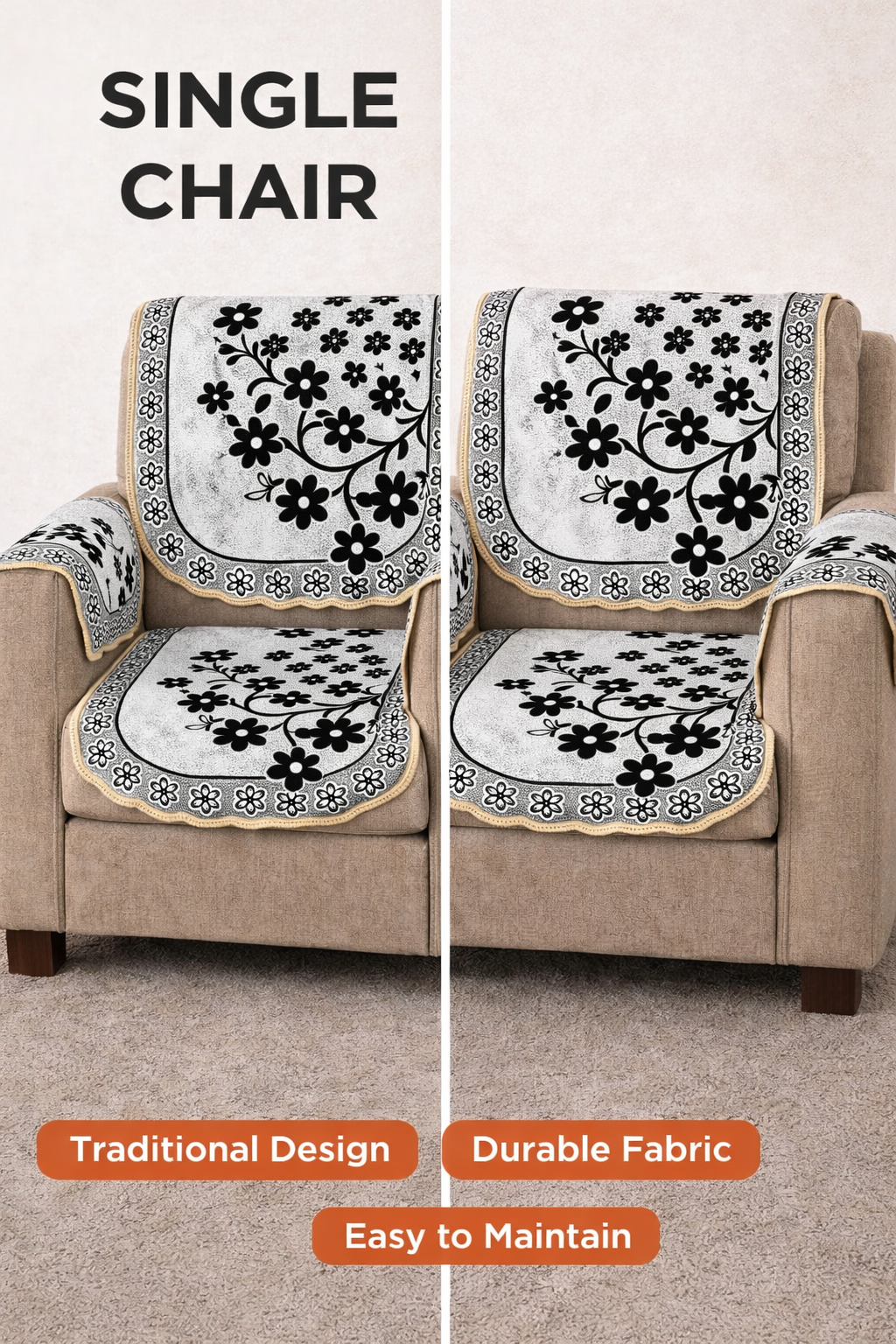 , Apne living room ko turant stylish look dene ke liye yeh best choice hai. Iska black floral running design sofa ko elegant banata hai aur saath hi dust, stains aur daily use se protect karta hai.
