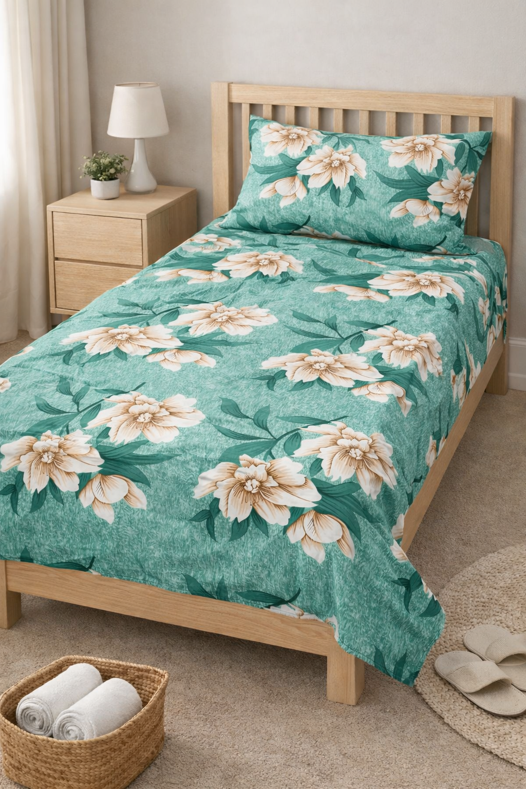 Bring freshness and elegance to your bedroom with this Premium Floral Single Bed Bedsheet. Is bedsheet ka design calming green background ke saath soft white floral print me hai, jo room ko clean, peaceful aur stylish look deta hai.